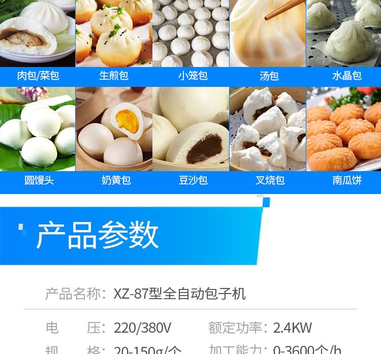 XZ-87型全自動(dòng)包子機(jī),可生產(chǎn)各種肉包、菜包、肉菜包、小籠包、湯包、水晶包、圓饅頭、奶黃包、豆沙包、叉燒包、南瓜餅、煎堆等十幾種包餡制品。適用于賓館、飯店、學(xué)校、機(jī)關(guān)企業(yè)食堂、饅頭或包子加工廠、早餐工程店及速凍食品廠等單位。可滿足不同客戶群體。免費(fèi)提供工藝技術(shù)。免費(fèi)上門培訓(xùn)指導(dǎo)安裝。