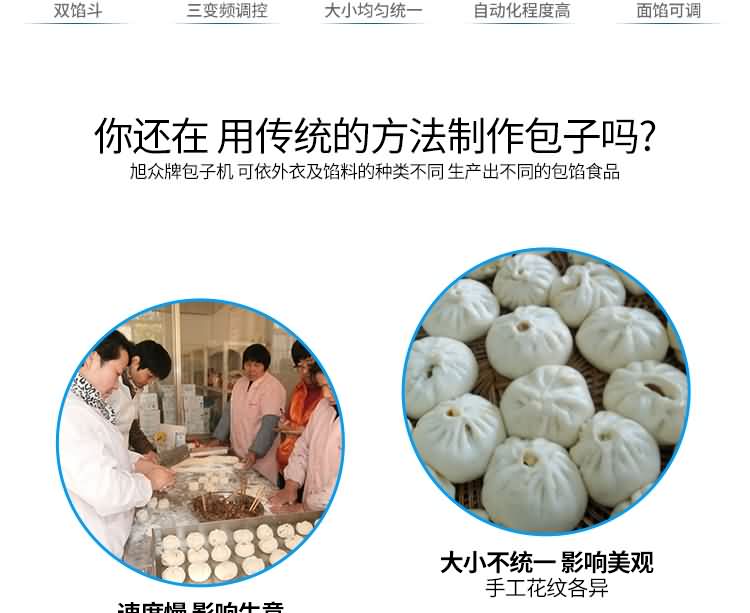 XZ-87S型雙餡斗全自動包子機(jī),可生產(chǎn)各種肉包、肉菜包、菜包、小籠包、湯包、水晶包、圓饅頭、奶黃包、豆沙包、叉燒包、南瓜餅等幾十種包餡制品。適用于賓館、飯店、學(xué)校、機(jī)關(guān)企業(yè)食堂、饅頭或包子加工廠、早餐工程店及速凍食品廠等單位??蓾M足不同客戶群體。免費提供工藝技術(shù)。免費上門培訓(xùn)指導(dǎo)安裝。