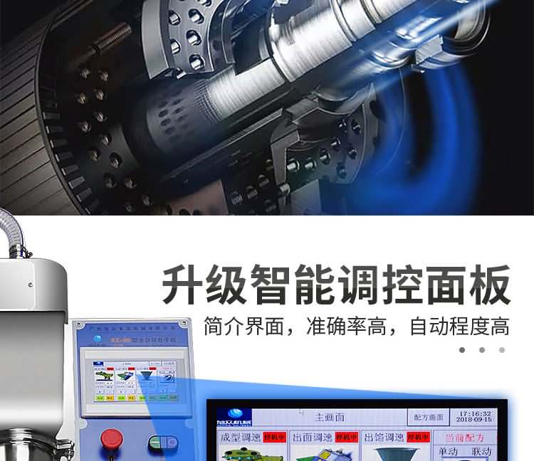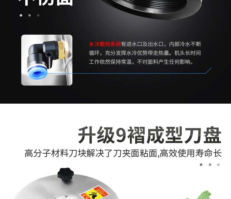 ◆出面系統(tǒng):采用單攪龍,大螺徑【北方機器由于加工手段受限一般攪龍很小需要轉(zhuǎn)速很快才能出料】半臥式出面方式。可以在擠相同分量面皮與小攪龍相比的情況下,大大降低攪龍轉(zhuǎn)速,讓面皮出料壓力小,達到揉面的效果,不傷面筋,口感佳!并配正副攪龍以保證出面均勻。