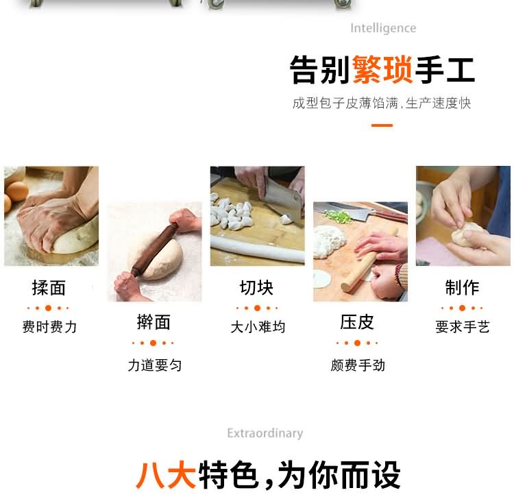 ◆ 送面、輸餡、成形、輸送均由獨(dú)立機(jī)構(gòu)完成,不發(fā)生連帶故障。