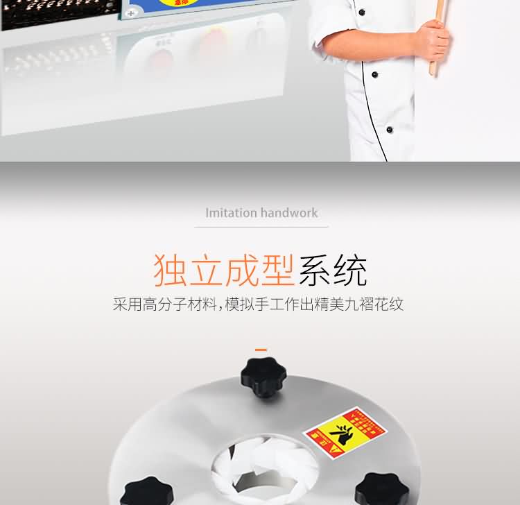 設(shè)備不傷面筋、仿手工捏花、比人工制作干凈、衛(wèi)生、成本低、效率高,是面食行業(yè)在高工薪時代的不二之選產(chǎn)品。操作面板可以旋轉(zhuǎn)、移動方便、占地空間小,適用于各種工作場所。本機(jī)提供免費(fèi)上門培訓(xùn)指導(dǎo)、安裝、調(diào)試、面點(diǎn)工藝傳授。