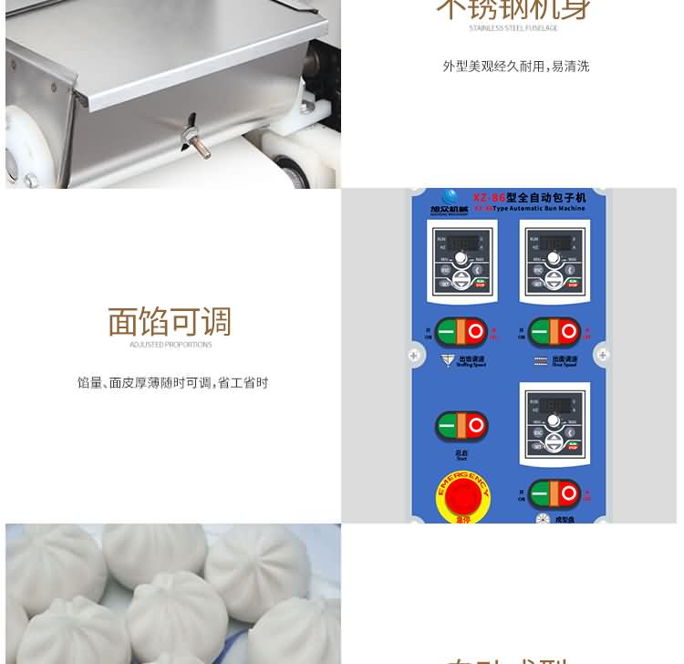 ZH-86型自動組合式包子饅頭機(jī)是一款產(chǎn)品性能穩(wěn)定、自動化程度高,功能多且產(chǎn)品多樣化的設(shè)備。采用高品質(zhì)微電腦變頻控制面板、電機(jī)電器,操作更方便、維護(hù)更簡單;不銹鋼制作、經(jīng)久耐用、美觀衛(wèi)生;可生產(chǎn)花包、光頭包、圓饅頭、南瓜餅、月餅、小籠包和各種肉餡、菜餡、純白糖餡、芝麻餡、豆腐餡等各種包餡食品。