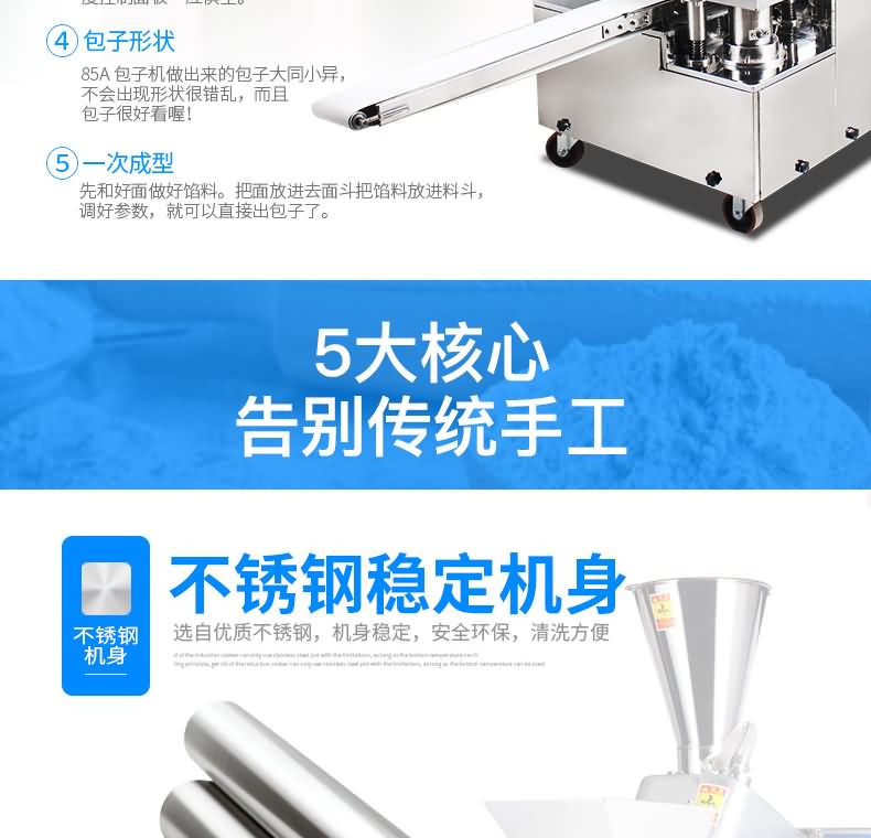 XZ -85A型全自動(dòng)包子機(jī)體積小重量輕,不銹鋼的外殼及食品接觸面,外觀精美,花紋更多,設(shè)計(jì)先進(jìn),生產(chǎn)性能穩(wěn)定,結(jié)構(gòu)簡(jiǎn)單,操作方便。可生產(chǎn)各種肉包、肉菜包、菜包、小籠包、湯包、水晶包、圓饅頭、奶黃包、豆沙包、叉燒包、南瓜餅等幾十種包餡制品。