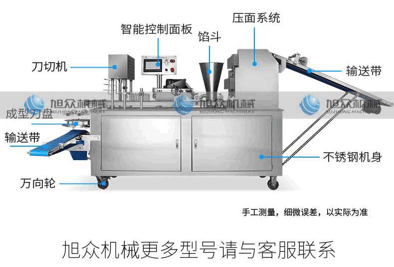◆壓面、成型、出餡、切刀一體化,操作方便,生產(chǎn)效率高,占地面積小。