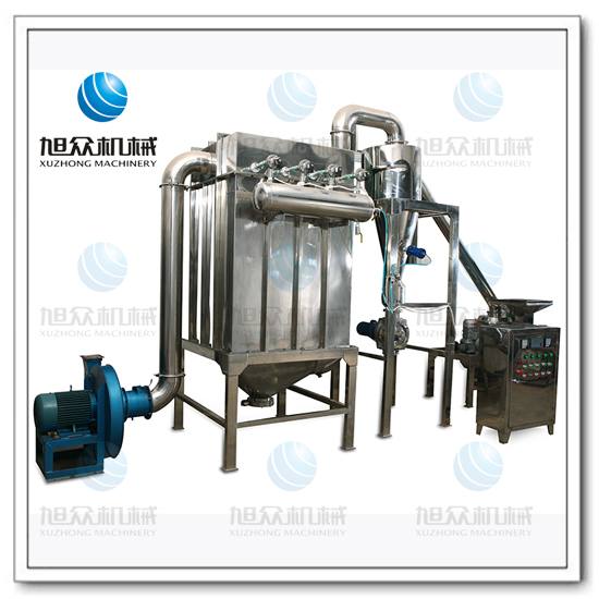 各型號(hào)超微粉碎機(jī)組都含主機(jī)、可調(diào)速的螺旋送料器、旋風(fēng)收集器加氣錘震蕩裝置、袋式除塵箱加氣流脈沖裝置、引風(fēng)電機(jī)造成負(fù)壓。大功率引風(fēng)電機(jī)不但可使輸送管道形成負(fù)壓,使達(dá)到要求的細(xì)粉自動(dòng)被風(fēng)力吸入管道,而且巨大的風(fēng)量還帶走了粉碎腔內(nèi)不斷產(chǎn)生的熱量,同時(shí)對(duì)粉碎機(jī)組的管道起到一個(gè)強(qiáng)有力的清理效果。旋風(fēng)收集器出料口加裝了關(guān)風(fēng)機(jī),出粉口無粉塵飛揚(yáng),達(dá)到了清潔、環(huán)保、節(jié)約的效果。