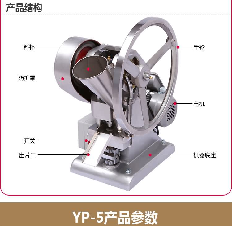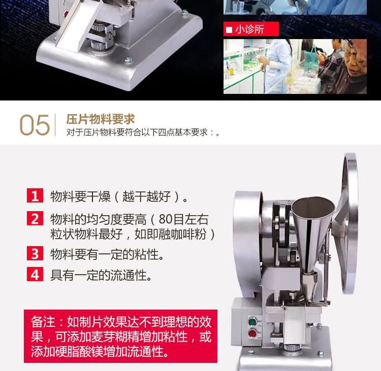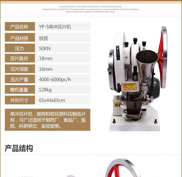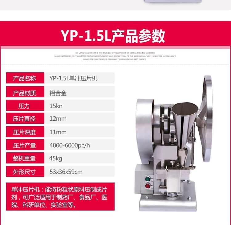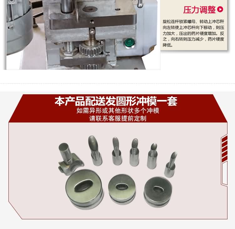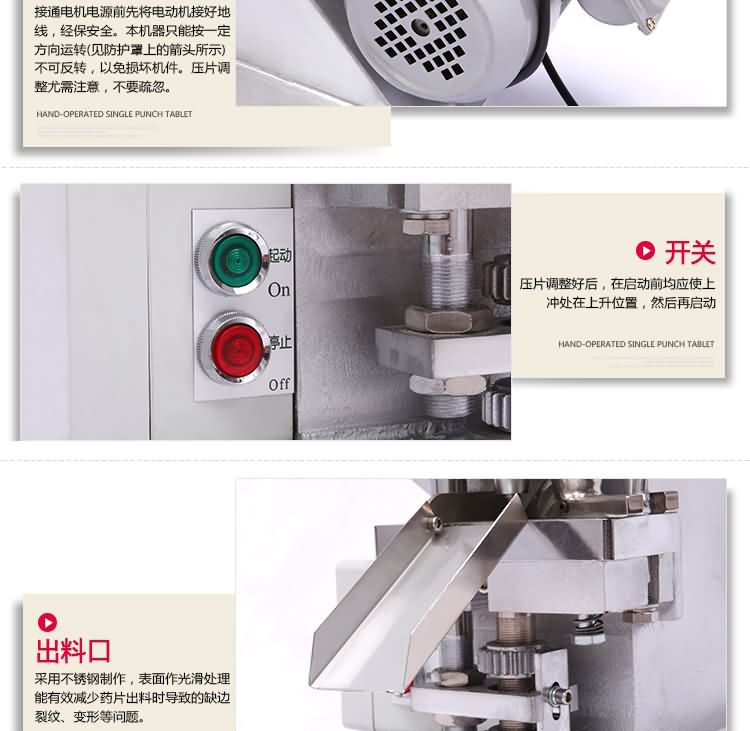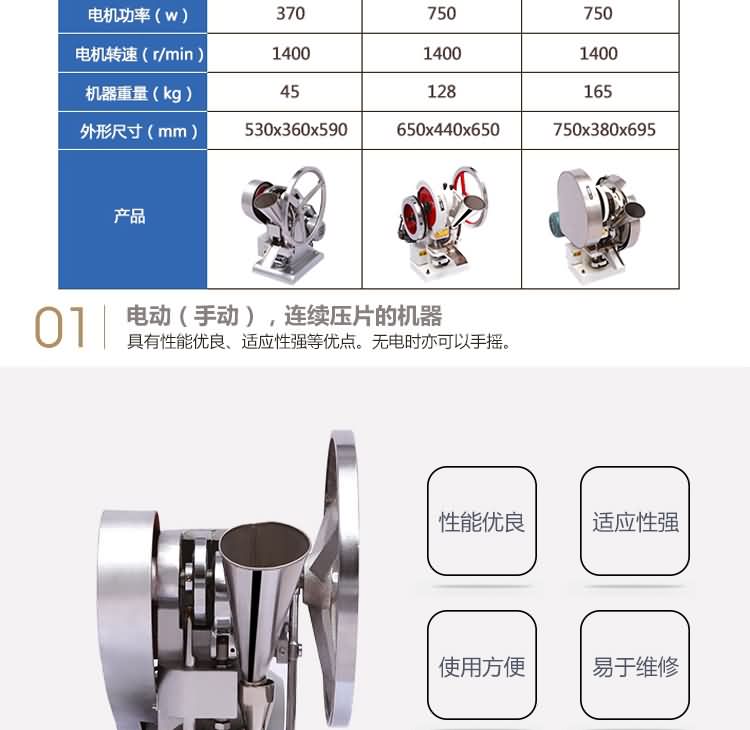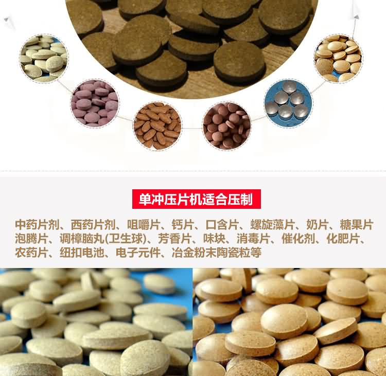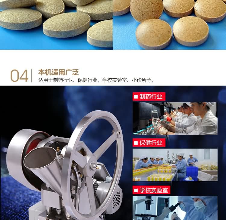 單沖壓片機適合壓制中藥片劑、西藥片劑、咀嚼片、鈣片、口含片、螺旋藻片、奶片、糖果片、泡騰片、調(diào)樟腦丸(衛(wèi)生球)、芳香片、味塊、消毒片、催化劑、化肥片、農(nóng)藥片、紐扣電池、電子元件、冶金粉末陶瓷粒等。是一種小型臺式電動(手動)連續(xù)壓片的機器,機上裝一付沖模,物料的充填深度,壓片厚度均可調(diào)節(jié)??筛鶕?jù)客戶要求提供各種形狀的模具。單沖壓片機能將粉粒狀原料壓制成片劑,可廣泛適用于制藥廠、化工廠、醫(yī)院、科研單位、實驗室試制和小批量生產(chǎn)。本機性能優(yōu)良,適應性強,使用方便,易于維修,體積小,重量輕,無電時也可手搖片。本機只裝一付沖模,物料的充填深度,壓片厚度均可調(diào)節(jié),能適應制藥行業(yè)壓制各種中、西藥征劑的要求和其它行業(yè)壓制各種類似產(chǎn)品的要求,深受各行業(yè)廣大用戶的歡迎。