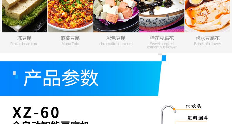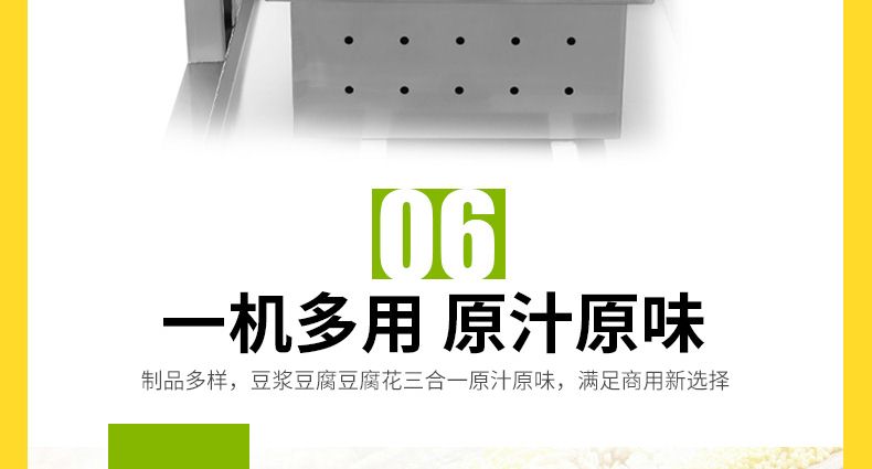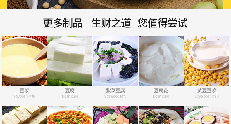 全自動(dòng)豆腐機(jī)系列,一機(jī)多用:可生產(chǎn)豆腐系列產(chǎn)品:?jiǎn)紊郏希┒垢?、多彩?腐、單色豆腐皮、多色豆腐皮、彩色豆腐干、豆?jié){、豆花等豆制品制作,還可以與其他設(shè)備和工藝配套生 產(chǎn)更多的豆制品。