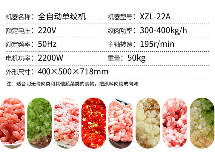 XZL-22A絞肉機吸取同行之優(yōu)點,改進新型絞肉切肉機械,它能切豬肉、羊肉、牛肉、魚及其它各種肉類、所切肉片厚度適中切片效率高,是餐廳、賓館、酒樓、單位食堂等絞肉切肉的理想機械,該機外形獨特,操作方便,維修簡單,工作效率高,在同行業(yè)中處領(lǐng)先地位,與食物接觸部分均采用不銹鋼制造符合食品衛(wèi)生標(biāo)準(zhǔn)。