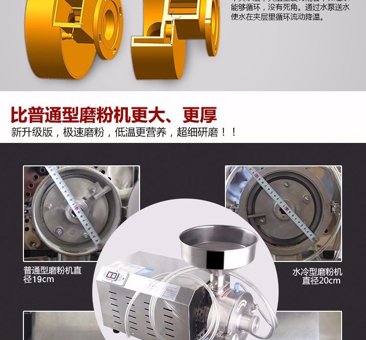 水冷工作原理:磨粉腔外壁和磨粉腔底部都設(shè)計(jì)有一個(gè)夾水層,夾層里設(shè)有隔套,保證水能夠循環(huán),沒(méi)有死角。通過(guò)水泵送水,使水在夾層里循環(huán)流動(dòng)降溫。