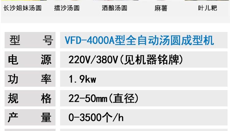 VFD-4000A型全自動湯圓成型機,功能齊全,適用性廣,自動化程度高,定量準(zhǔn)確,操作簡單,只要將面團與餡料放入進料口,開機便可自動搓圓、成型,制品不易變形。