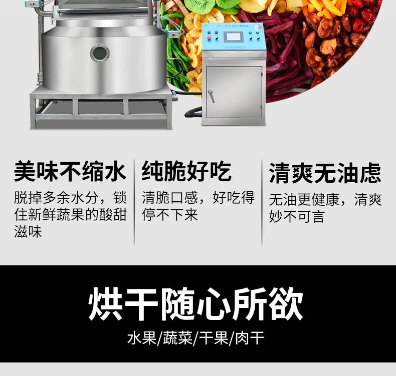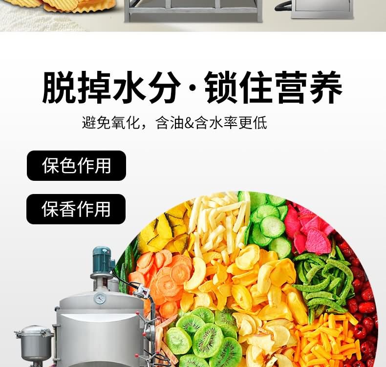 ●真空油炸是在低溫(80~120℃)對食品進(jìn)行油炸、脫水,可以有效地減少高溫對食品營養(yǎng)成分的破壞。