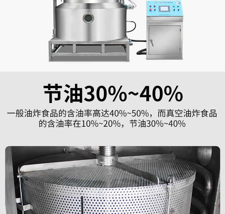 ●低溫真空油炸可以防止食用油脂劣化變質(zhì),不必加入其他抗氧化劑,可以提高油的反復(fù)利用率,降低成本。一般油炸食品的含油率高達(dá)40%~50%,而真空油炸食品的含油率在10%-20%,節(jié)油30%-40%,節(jié)油效果顯著。食品脆而不膩,可貯性能良好。