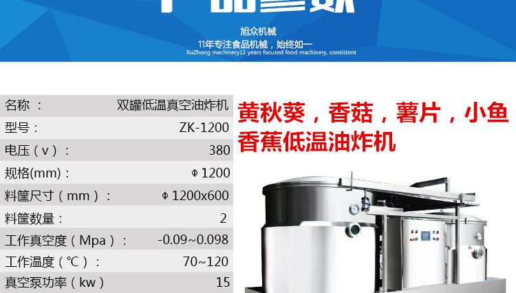 ZK-1200真空油炸機,適用于水果類、蔬菜類、干果類、水產(chǎn)品機畜禽肉類等。油炸食品不易褪色、褐色,可以保持原料本身的顏色