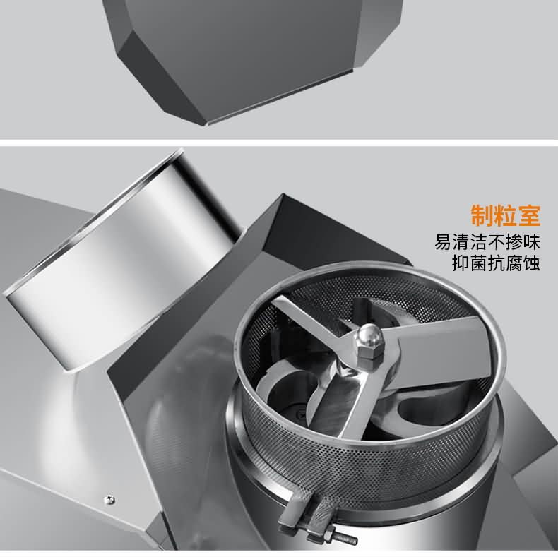 搖擺式顆粒機(jī)制得的顆粒一般粒徑分布均勻,有利于濕粒均勻干燥。它的主要特點(diǎn)為旋轉(zhuǎn)為旋轉(zhuǎn)滾筒的轉(zhuǎn)速可以調(diào)節(jié),篩網(wǎng)裝卸容易,還可適當(dāng)調(diào)節(jié)其松緊。機(jī)械傳動(dòng)系統(tǒng)全部密封在機(jī)體內(nèi),并附有調(diào)節(jié)系統(tǒng),提高了機(jī)件的壽命。但由于成粒過程是由滾筒直接壓迫篩網(wǎng)而成粒的,物料對篩網(wǎng)的擠壓力的摩擦力均較大。使用金屬篩網(wǎng)時(shí)易產(chǎn)生金屬污染處方,而尼龍篩網(wǎng)由于容易破損需經(jīng)常更換,在使用時(shí)應(yīng)加以注意。
